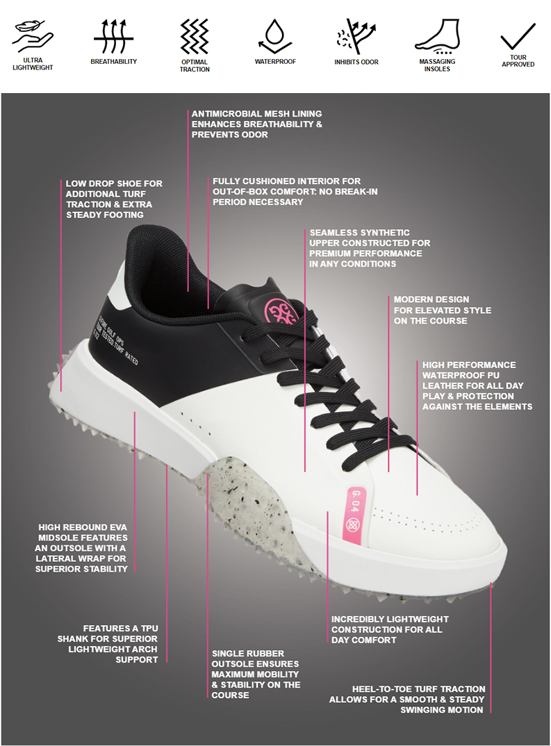 FEATURES SEAMLESS SYNTHETIC UPPER CONSTRUCTED FOR PREMIUM PERFORMANCE IN ANY CONDITIONS HIGH REBOUND EVA MIDSOLE FEATURES AN OUTSOLE WITH A LATERAL WRAP FOR SUPERIOR STABILITY SINGLE RUBBER OUTSOLE ENSURES MAXIMUM MOBILITY & STABILITY ON THE COURSE LOW DROP SHOE FOR ADDITIONAL TURF TRACTION & EXTRA STEADY FOOTING FEATURES A TPU SHANK FOR SUPERIOR LIGHTWEIGHT ARCH SUPPORT HEEL-TO-TOE TURF TRACTION ALLOWS FOR A SMOOTH & STEADY SWINGING MOTION