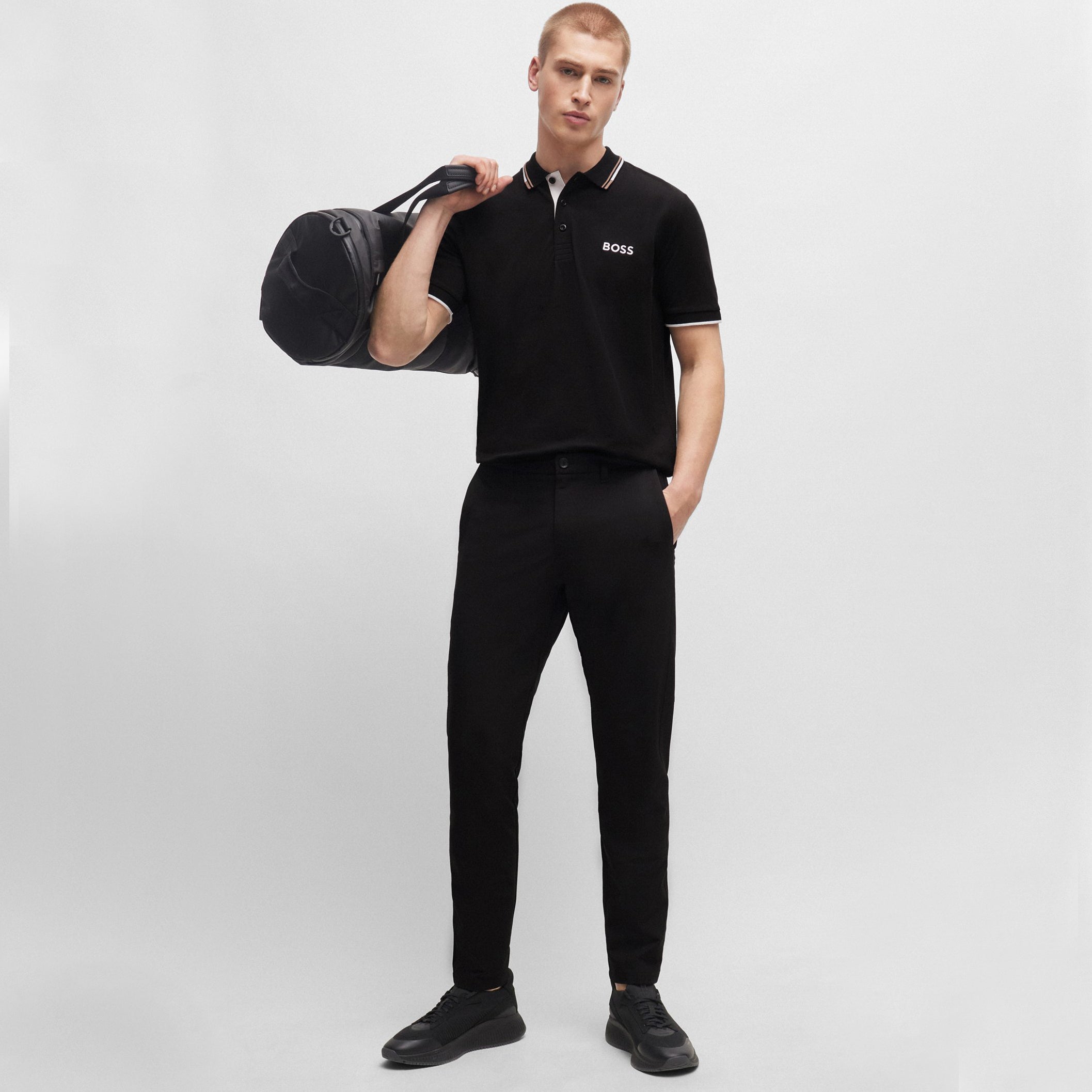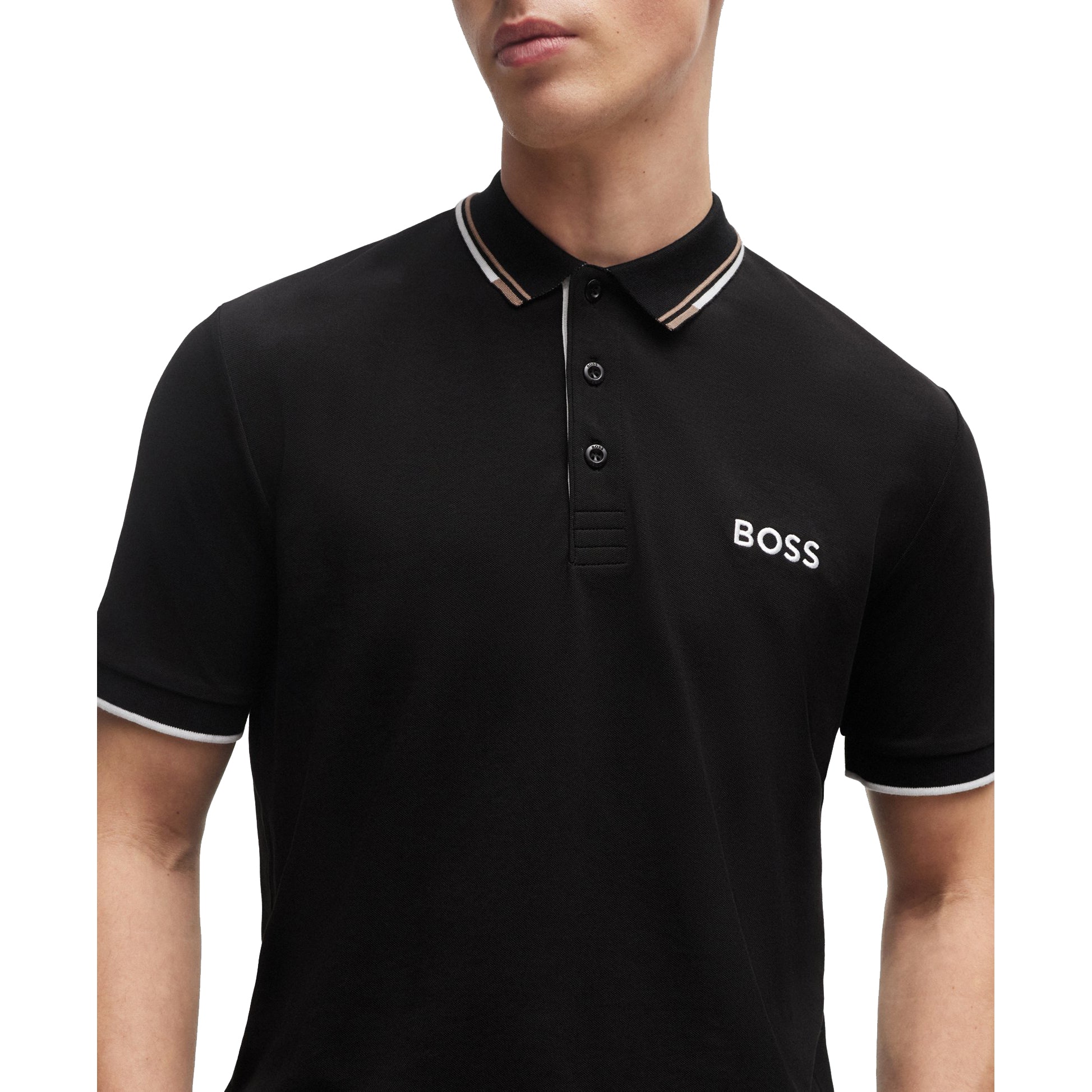 A premium golf polo shirt by BOSS Menswear. Detailed with contrast branding at the back neck and left chest, this short-sleeved polo shirt is cut to a regular fit in cotton-blend piqué with stretch for active movement. The collar and cuffs are trimmed with 3D stripes to deliver an athletic finish.