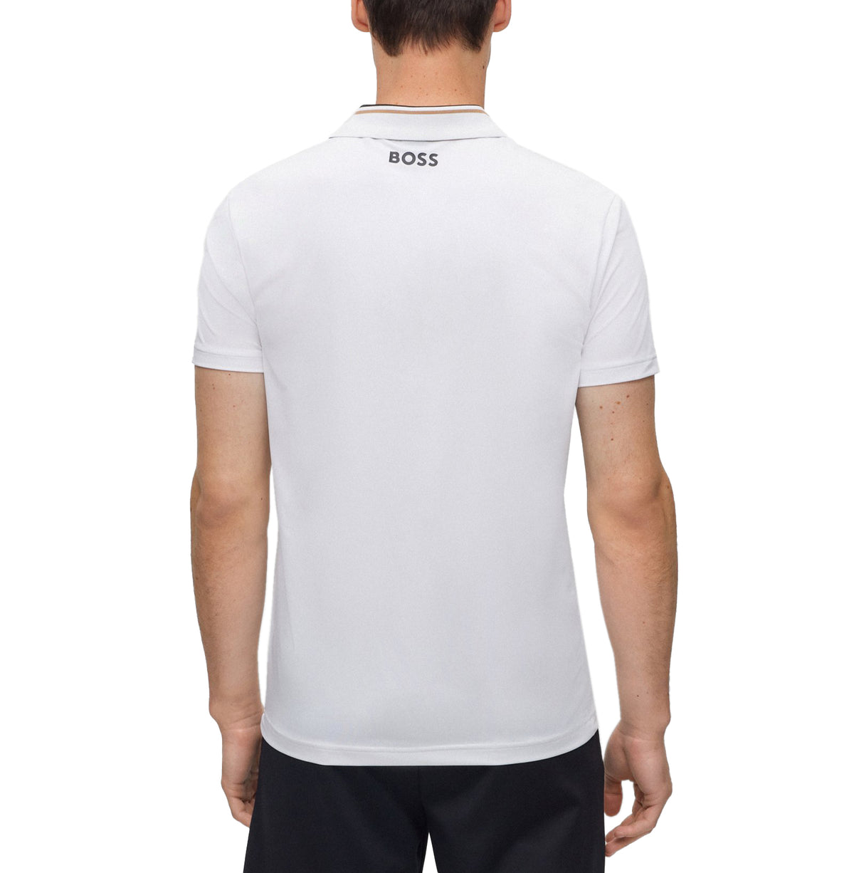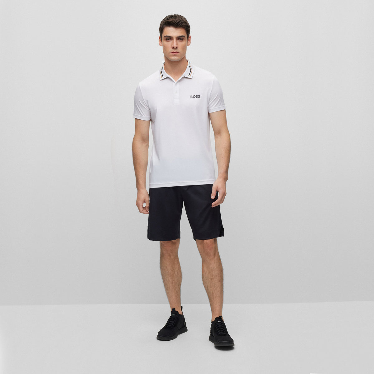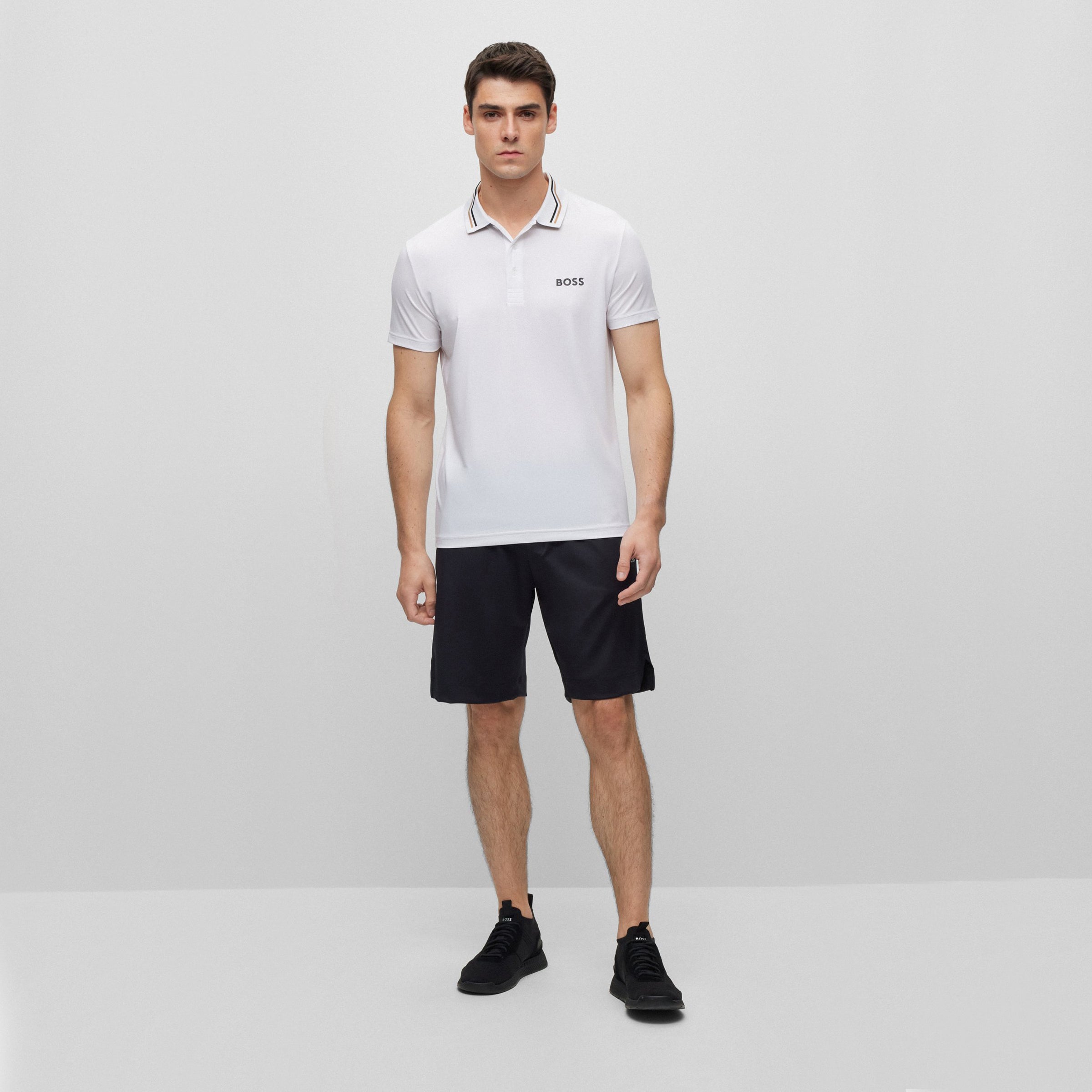 A short-sleeved polo shirt cut to a straight fit in stretch jersey with a collar stripe and contrast logo by BOSS Menswear. Part of the dynamic BOSS x Matteo Berrettini capsule collection, co-created by the Italian professional tennis player.