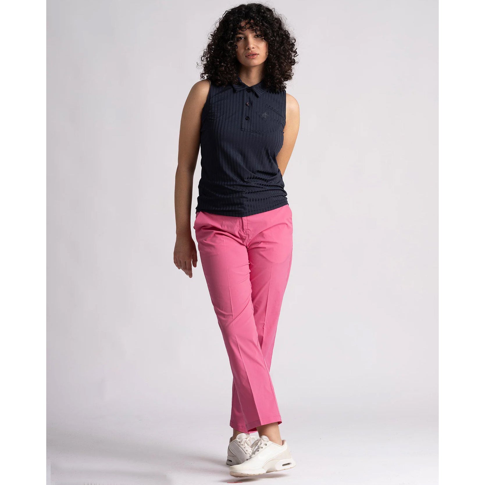 The Cross Women's Andrea Sleeveless Polo Golf Shirt is a lightweight and elegant choice for warm days on the course. Made from a unique jacquard-knitted rib fabric, it features a soft drape and built-in stretch that moves effortlessly with you. With a sleeveless design and a fitted armhole construction, this polo delivers a clean, tailored silhouette that performs as well off the course as it does on it.