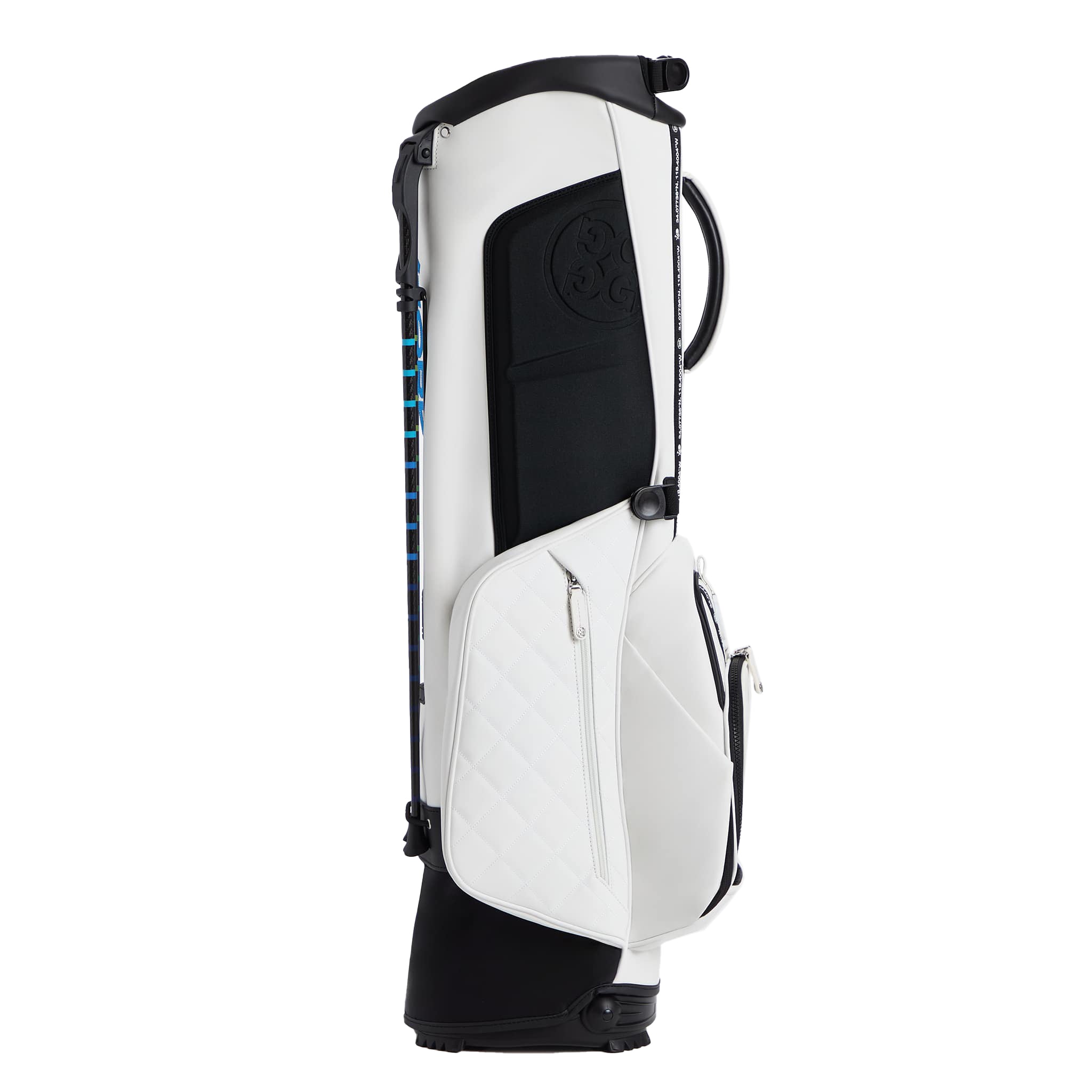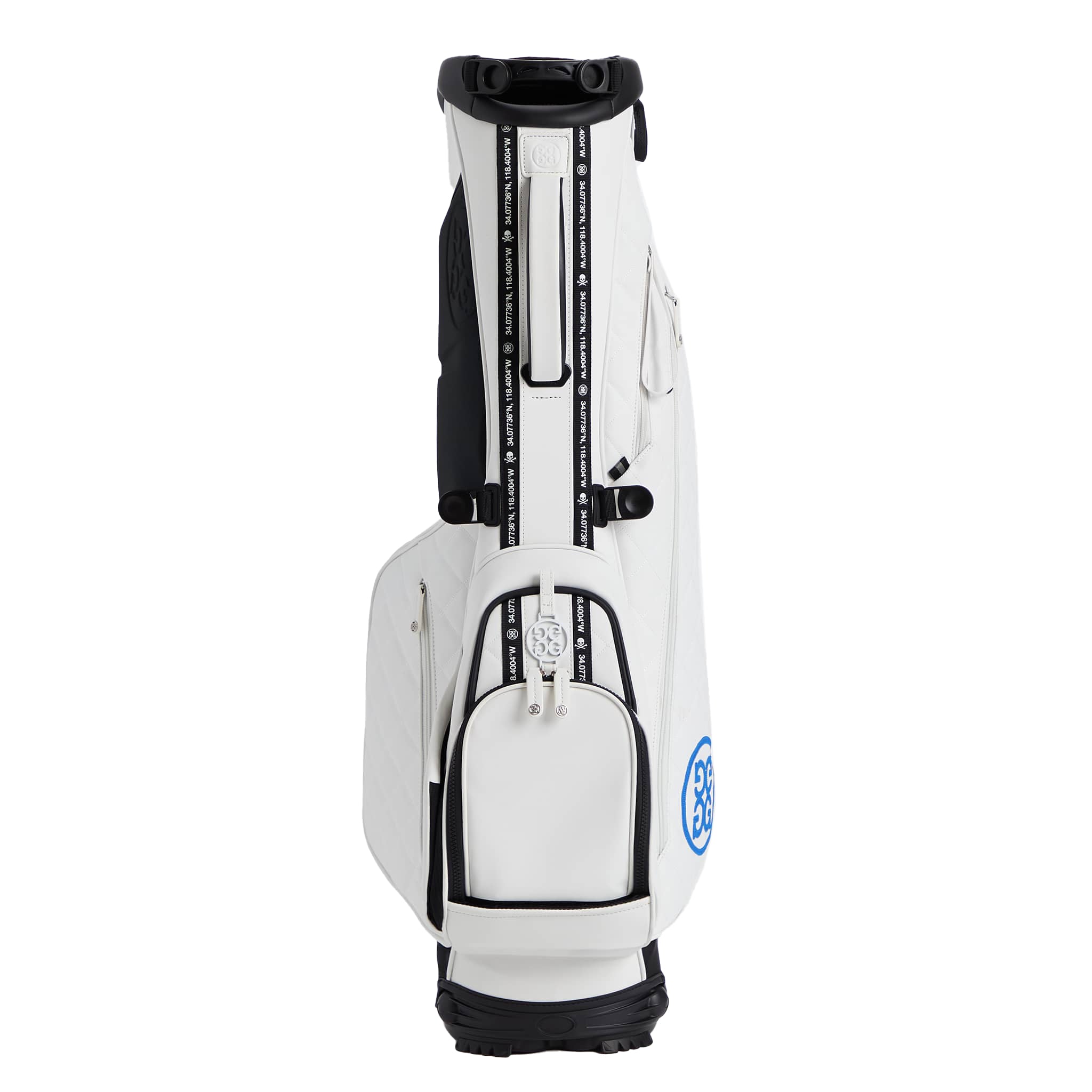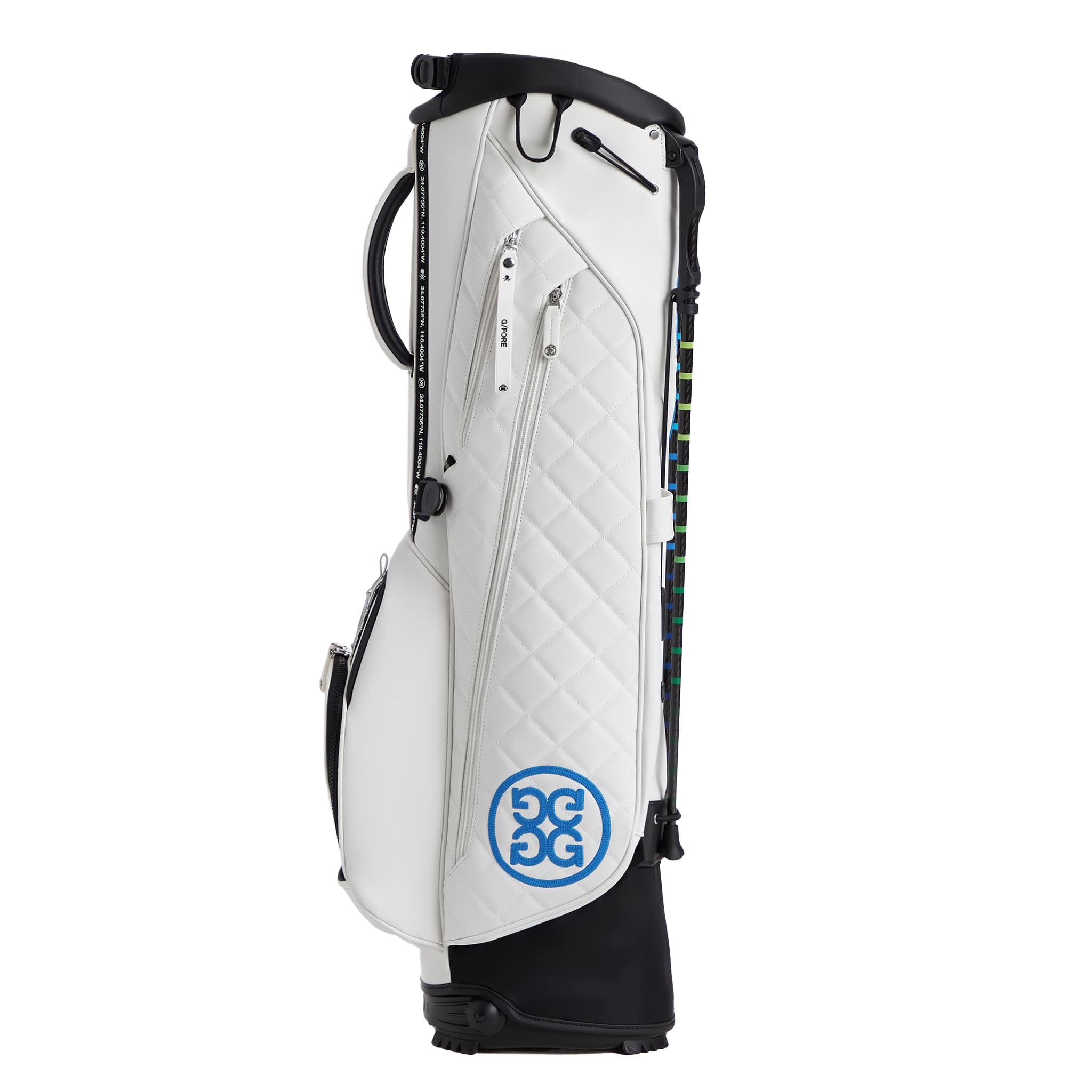 G/FORE'S BEST-SELLING CARRY BAG FEATURES A 4-WAY TOP DESIGNED WITH A VELOUR LINING FOR MAXIMUM CLUB PROTECTION, A ROTATOR STAND SYSTEM FOR MAXIMUM STABILITY, A SELF-ADJUSTING CONVERTIBLE STRAP FOR AUTOMATIC EQUAL DISTRIBUTION, AND A COMPRESSION MOLDED NEOPRENE BACK PANEL FOR COMFORT. THE DAYTONA PLUS FEATURES ELEVATED GROSGRAIN DETAILING AND QUILTED PANELS, PLUS A SELF-COLOURED RAIN HOOD, AND AN UMBRELLA HOLDER. IT'S ALSO EQUIPPED WITH SEVERAL POCKETS, INCLUDING A LARGE GARMENT COMPARTMENT, WATER RESISTANT POCKET FOR PERSONAL ITEMS, COOLER-LINED WATER BOTTLE SLEEVE, MAGNETIC VELOUR-LINED RANGEFINDER POCKET, AND A PEN POCKET. WEIGHS 5.75 LBS.