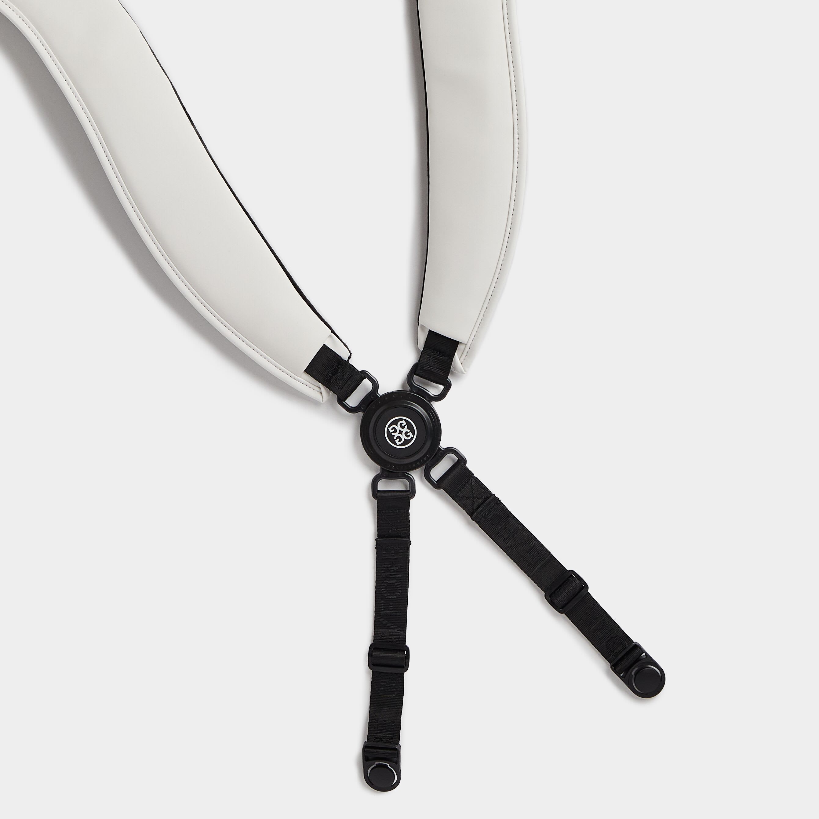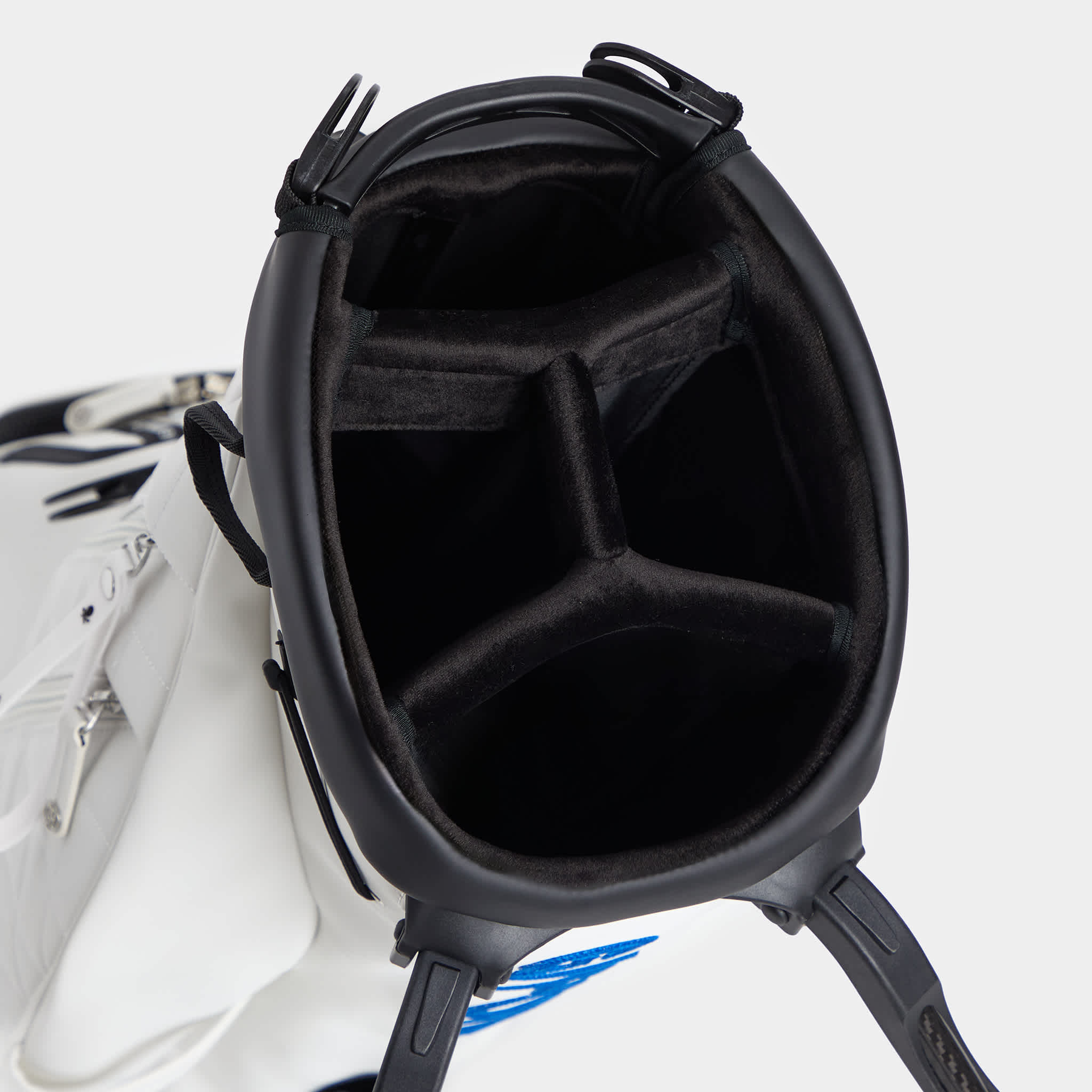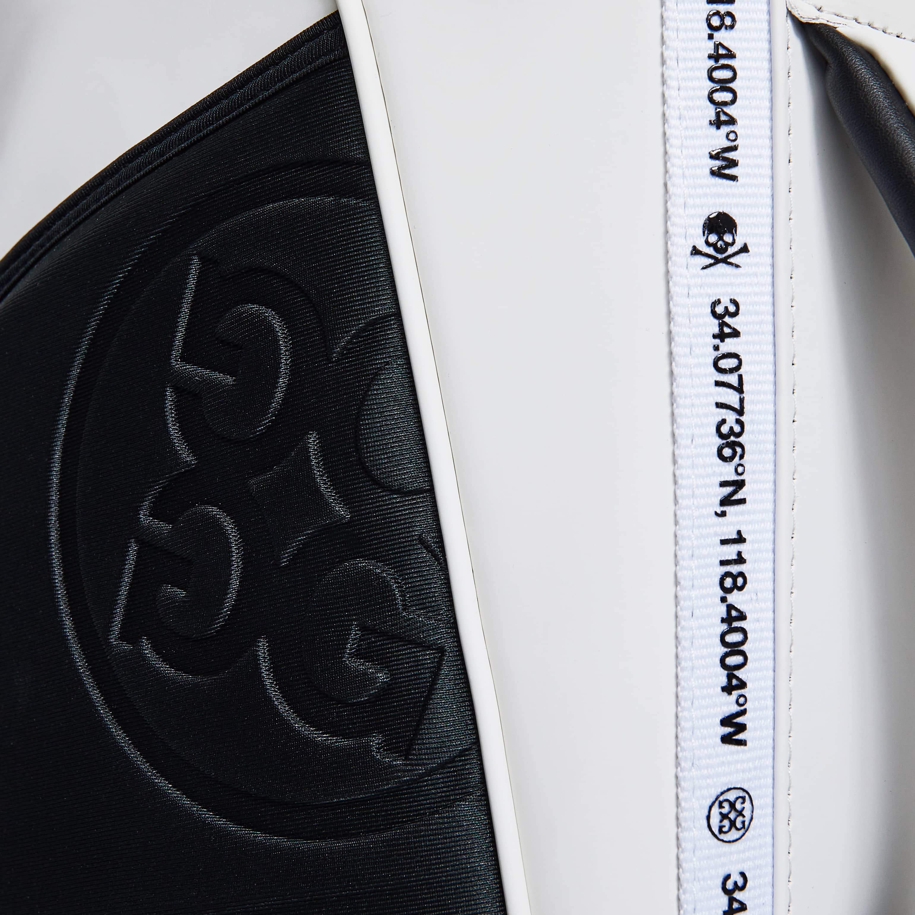 G/FORE'S BEST-SELLING CARRY BAG FEATURES A 4-WAY TOP DESIGNED WITH A VELOUR LINING FOR MAXIMUM CLUB PROTECTION, A ROTATOR STAND SYSTEM FOR MAXIMUM STABILITY, A SELF-ADJUSTING CONVERTIBLE STRAP FOR AUTOMATIC EQUAL DISTRIBUTION, AND A COMPRESSION MOLDED NEOPRENE BACK PANEL FOR COMFORT. THE DAYTONA PLUS FEATURES ELEVATED GROSGRAIN DETAILING AND QUILTED PANELS, PLUS A SELF-COLOURED RAIN HOOD, AND AN UMBRELLA HOLDER. IT'S ALSO EQUIPPED WITH SEVERAL POCKETS, INCLUDING A LARGE GARMENT COMPARTMENT, WATER RESISTANT POCKET FOR PERSONAL ITEMS, COOLER-LINED WATER BOTTLE SLEEVE, MAGNETIC VELOUR-LINED RANGEFINDER POCKET, AND A PEN POCKET. WEIGHS 5.75 LBS.