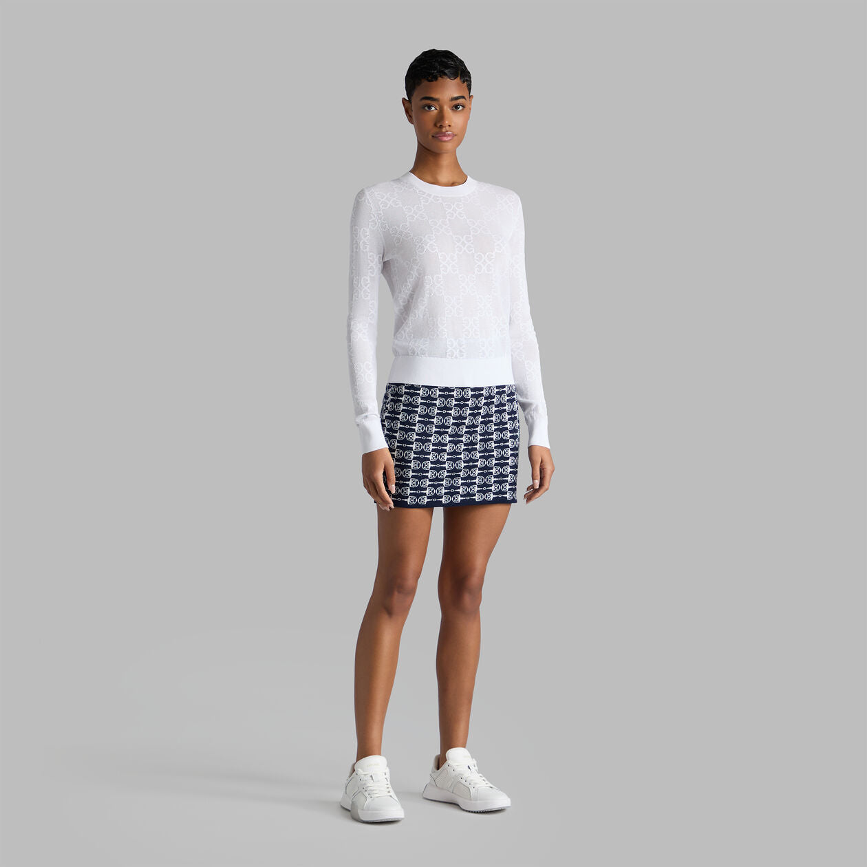 THERE'S NOTHING LIKE A PERFECTLY FITTED SWEATER AND THIS POINTELLE G CREWNECK IS A GREAT EXAMPLE. MADE OF OUR SOFT MONOGRAM STITCH JERSEY FOR COMFORT AND EXTRA BREATHABILITY, IT'S PERFECT FOR ALL DAY WEAR AND VERSATILITY. TUCK INTO A SKORT FOR A POLISHED, YET EFFORTLESS LOOK.