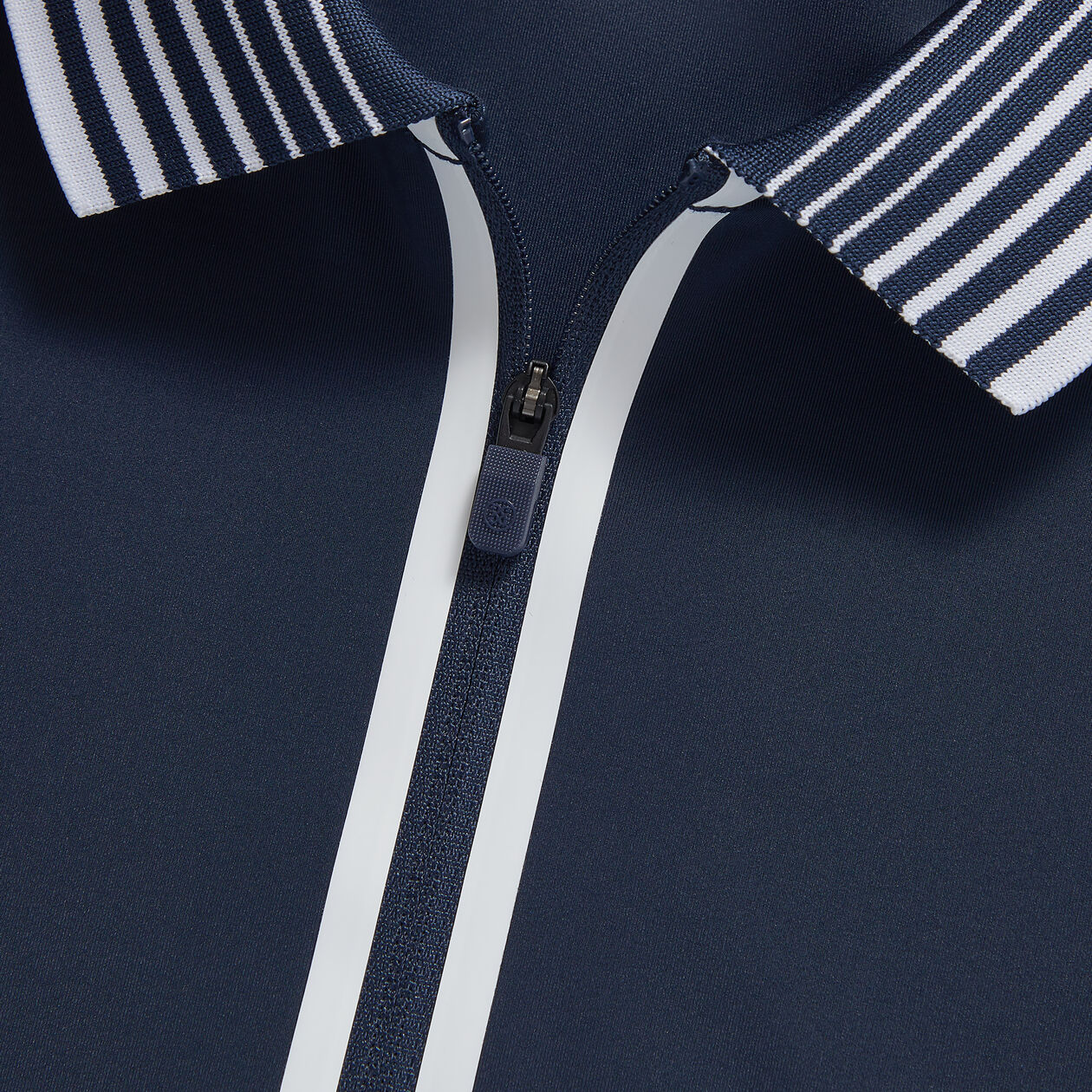 MOISTURE WICKING PROPERTIES FOR HOT DAYS QUARTER LENGTH ZIPPER WITH BRANDED RUBBER PULL & FRAMED WITH HEAT BONDED TAPE FLAT KNIT COLLAR WITH VARIEGATED STRIPE DETAILS TONAL SILICONE LOGO ON THE BACK YOKE