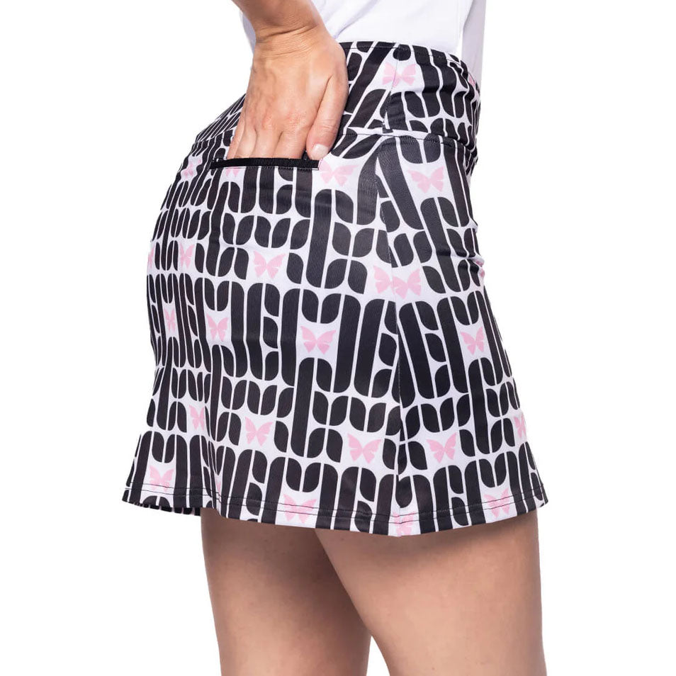 The Golftini Women's Sisterhood 17.5" Golf Skort in Black Print brings a touch of luxury to your golf wardrobe. Featuring a stunning geometric butterfly print in black, white, and rose pink, this skort combines elegance with high-performance design. Crafted from StretchTech fabric with 4-way stretch and moisture-wicking properties, it ensures comfort and flexibility for every swing. Thoughtfully designed with functional pockets and a feminine aesthetic, the Sisterhood Skort is perfect for both style and performance on the course.
