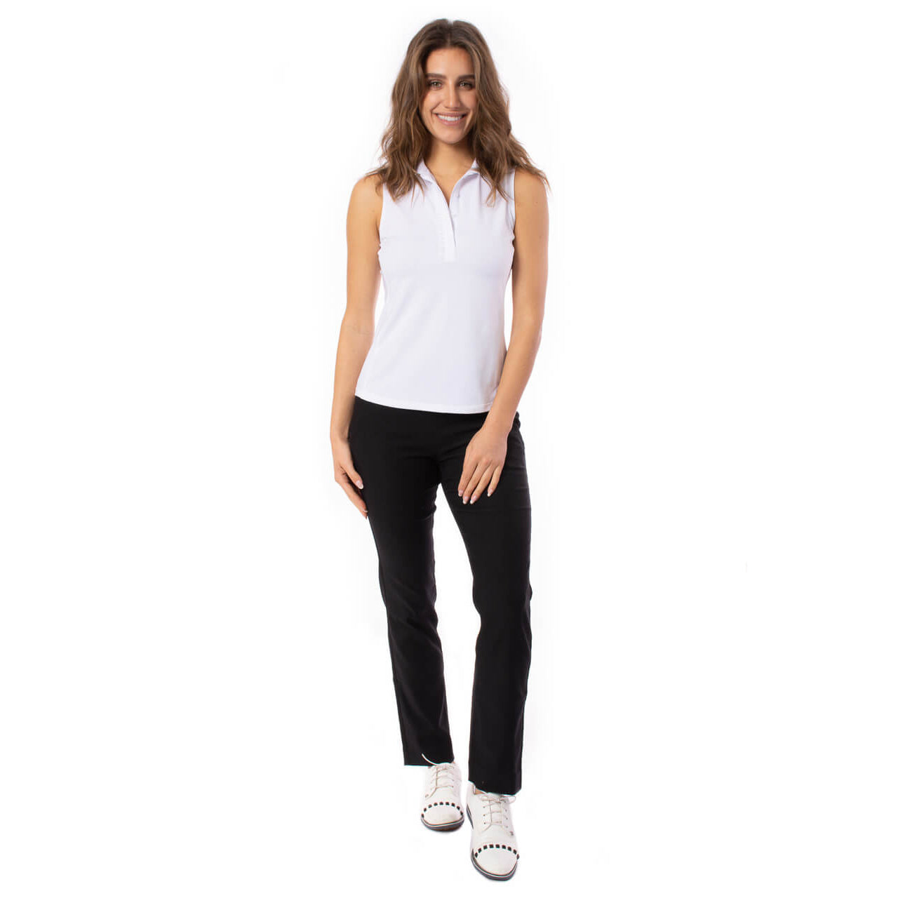 The Golftini Women’s Ruffle Sleeveless Golf Polo combines feminine style with high-performance functionality. Crafted from StretchTech fabric, this moisture-wicking, wrinkle-free polo keeps you cool and comfortable on the course. Featuring a ruffle placket with hidden buttons and princess seams, it delivers a flattering silhouette while UPF 30+ sun protection ensures coverage during sunny rounds.
