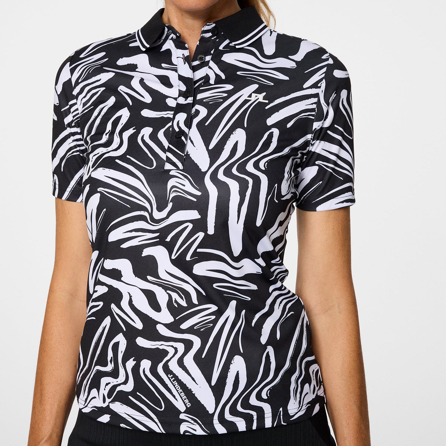 J.Lindeberg Women's Georgia Print Polo Golf Shirt - Scribble JL Navy Crafted from innovative 37.5® TX Jersey, the J.Lindeberg Georgia Print Polo is engineered to help maintain your ideal body temperature of 37.5°C, ensuring comfort through every round. With a bold Scribble JL Navy print, this polo blends standout style with advanced performance technology. Moisture-wicking, fast-drying, and built with technical four-way stretch, it supports active movement while keeping you cool and focused.