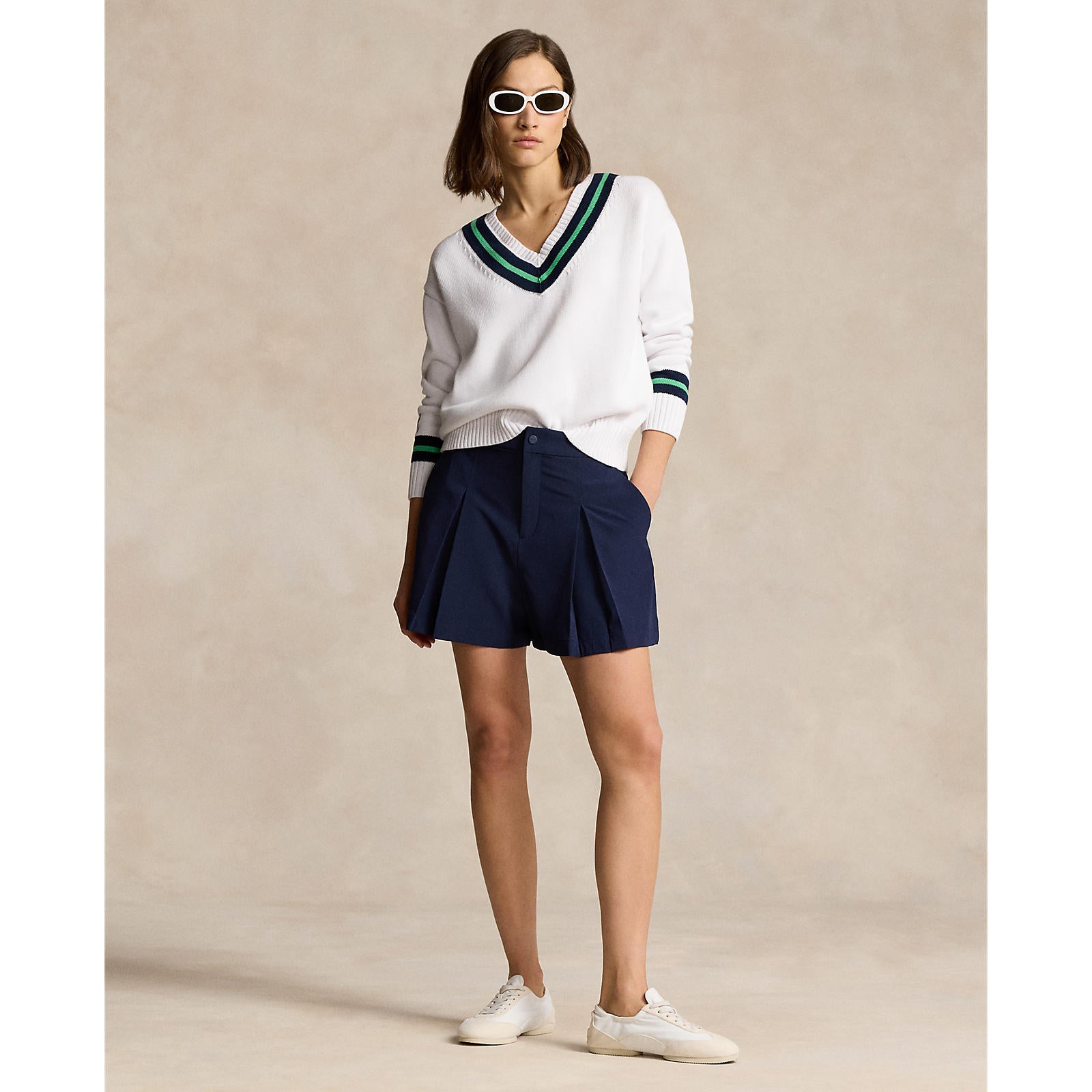 Designed for comfort and clean lines, the RLX Ralph Lauren Women's Double-Faced Wide-Leg Shorts feature box pleats and a soft, structured silhouette. Blending refined tailoring with performance-ready four-way stretch, these shorts are ideal for movement and style.