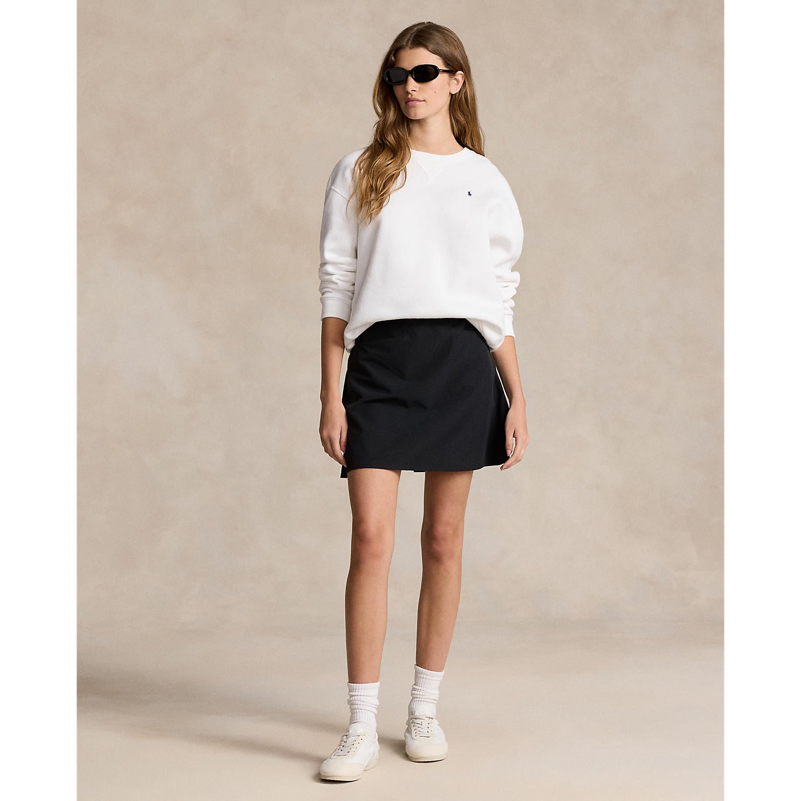 Straight fit. Intended to hit at the mid-thigh. Size medium has a 17" length. Skirt length changes ½" between sizes. Elasticized waist. Two front angled pockets. Back right welt pocket. Attached interior short. RLX rubber-printed at the front right hem. Back pleats. Back yoke. Shell and interior short: polyester, elastane.